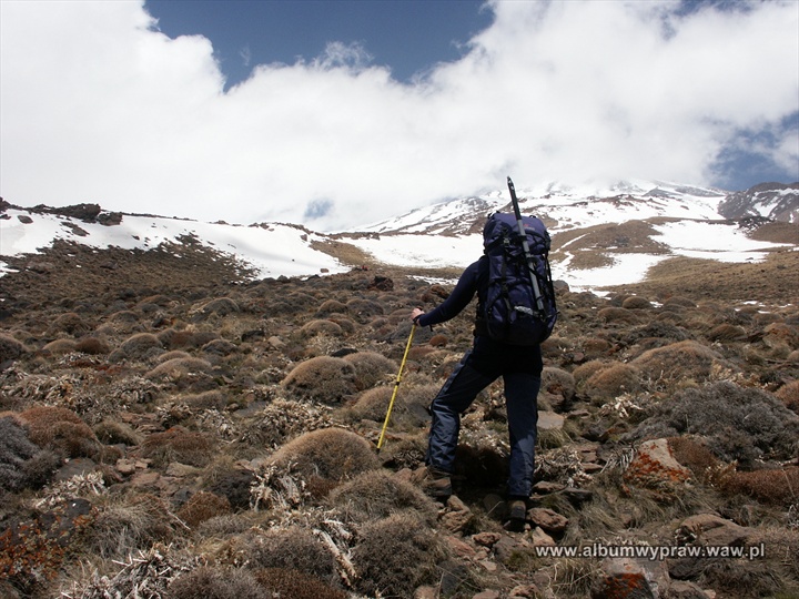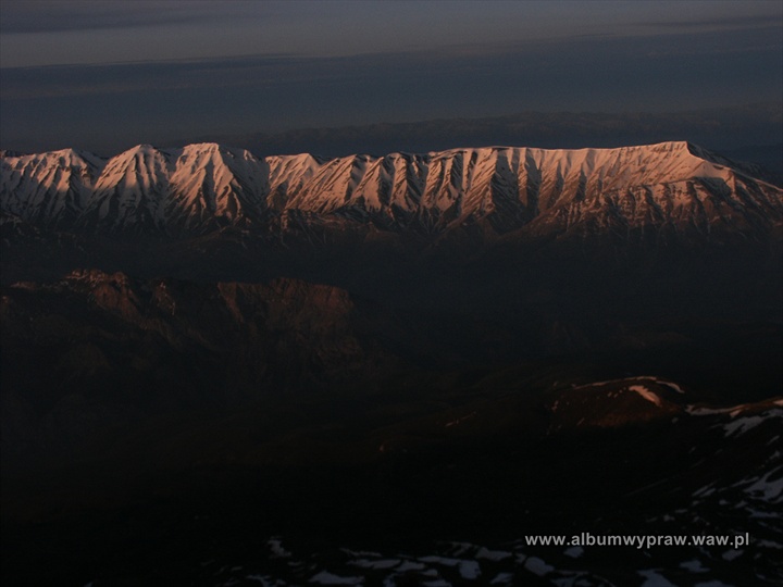 30 kwietnia 2004 przylecieliśmy do stolicy Iranu, olbrzymiego miasta Teheran i tak rozpoczęła się wyprawa na Damavand 5671 m, najwyższy szczyt tego kraju. Po licznych perturbacjach, polegających na wykłócaniu się o każdego dolara czy poszukiwaniu camping gazu, wreszcie udało nam się opuścić Teheran. Ruszyliśmy na północ w kierunku Morza Kaspijskiego do Reyneh, wioski leżącej pod południową ścianą wulkanu Mount Damavand, w górach Elburs. Góry te rozciągają się na obszarze 900 km, okalając od południa Morze Kaspijskie. Mount Damavand jest wyższy o prawie 1000 metrów niż drugi co do wysokości Alam-kuh 4850 m. Wygląda bardzo majestatycznie wśród okalających go niższych szczytów.