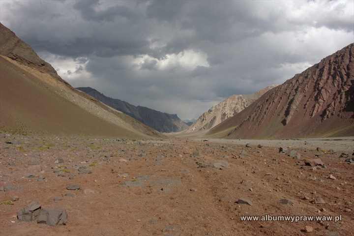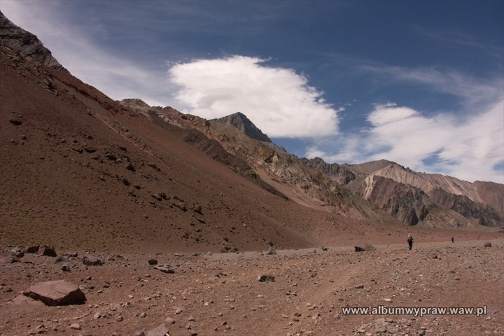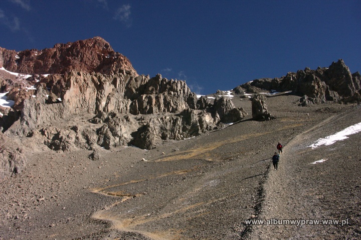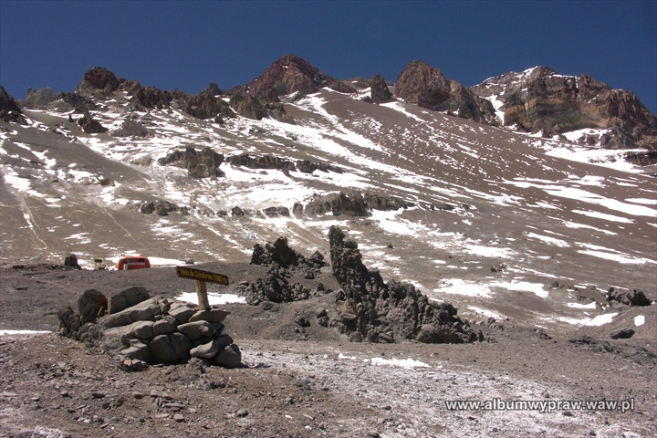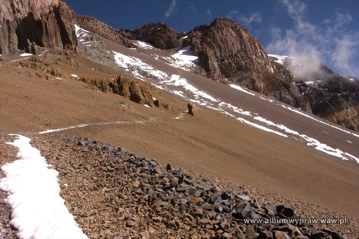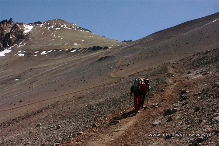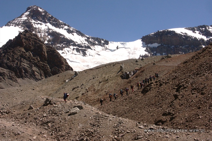 Następnie podchodzi się pod stromy próg do bazy Plaza de Mulas na wysokości 4300 m.