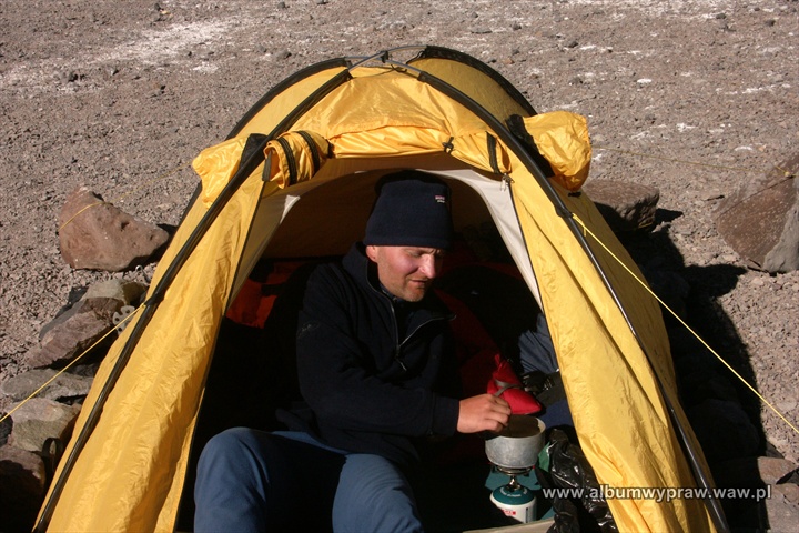 Rozpoczęliśmy gotowanie nie wychodząc ze śpiworów. Było tak zimno, że przekładałem wyjście na atak szczytowy z godziny 7.00 na 8.00, a potem z 8.00 na 9.00.