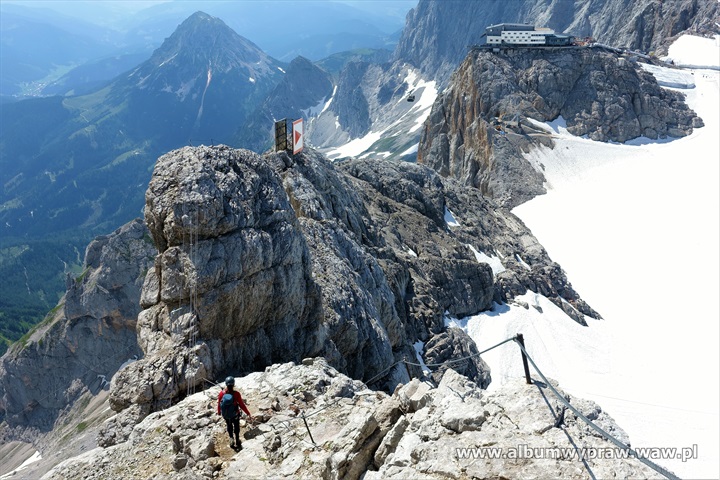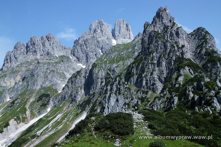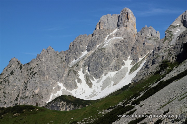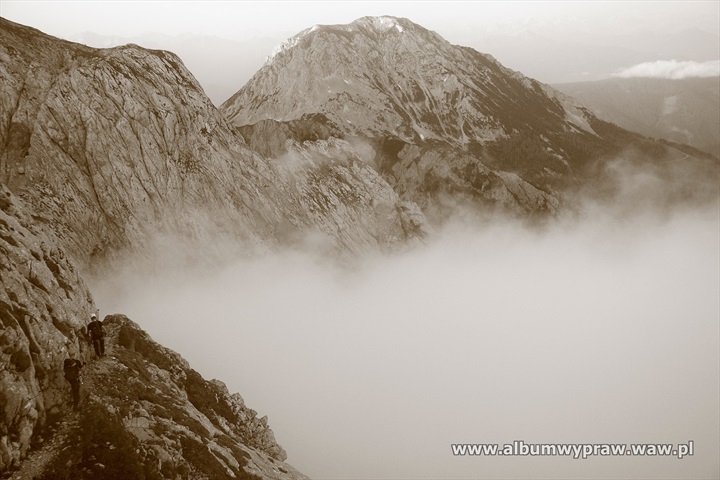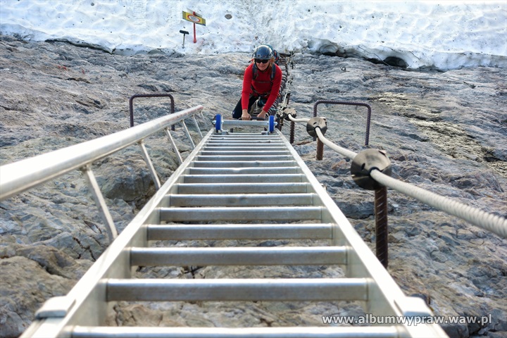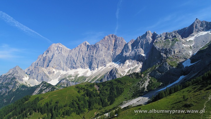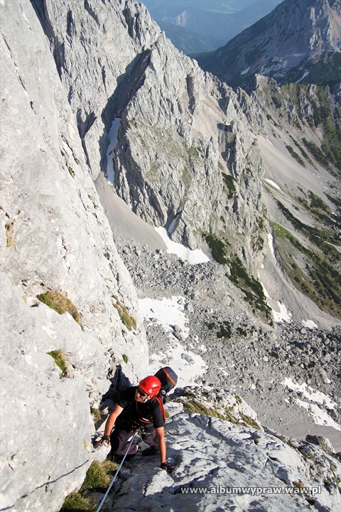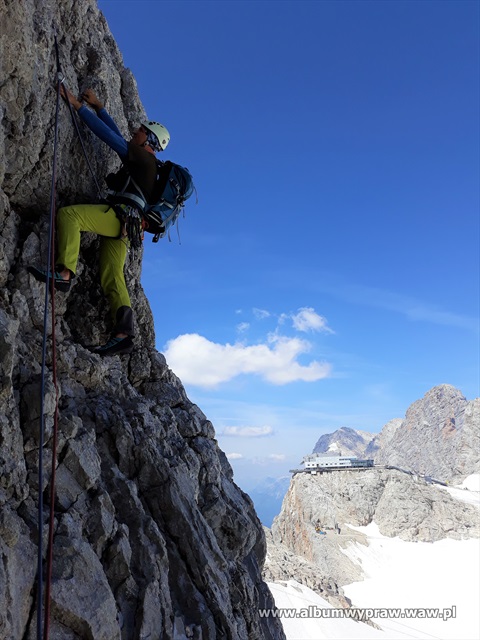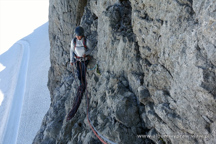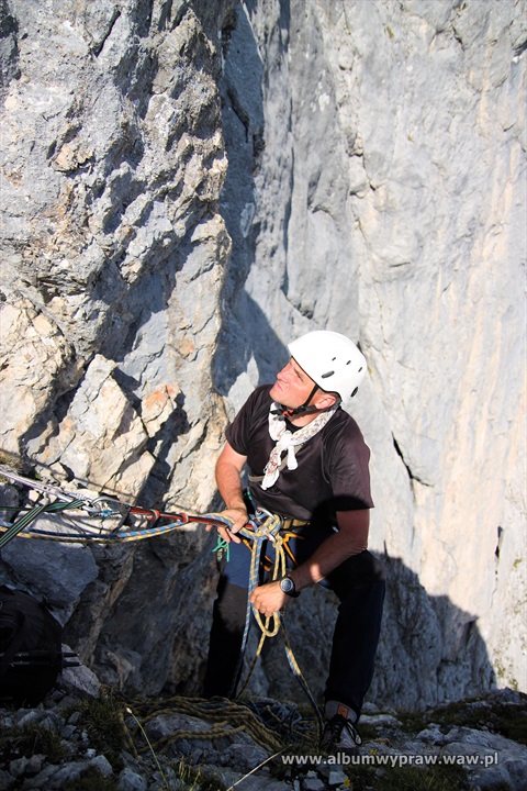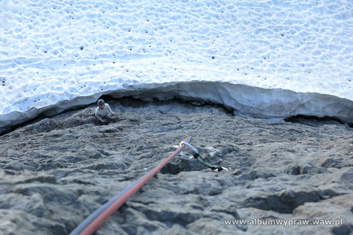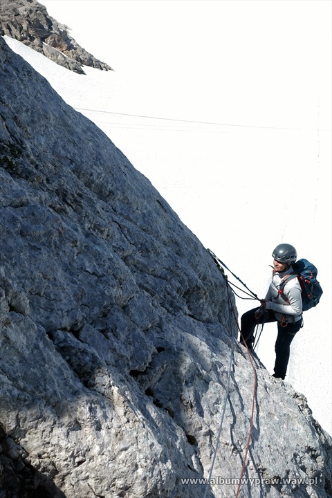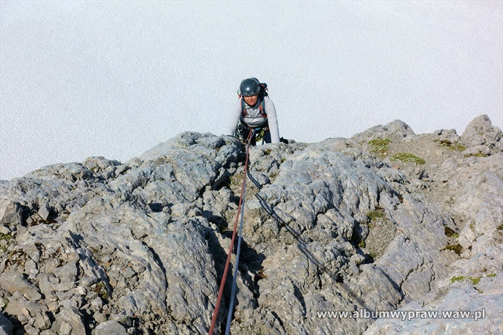 DACHSTEINDachstein nie jest rejonem wspinaczkowym dla początkujących, są tu w większości długie i poważne drogi, na które idąc warto mieć spory bagaż doświadczenia górskiego. Największe wrażenie na wspinaczu robi imponujący mur o wysokości 600-800 metrów i szerokości kilku kilometrów, który tworzą południowe ściany trzech wielkich szczytów: Torstein, Mitterspitz i Hoher Dachstein. Wspinanie na tych ścianach to duże górskie przedsiewzięcie, bo drogi liczą czasami nawet 40 wyciągów i nie są łatwe orientacyjnie. Jeżeli dodamy, że podejścia pod ściany są dość długie to nie dziwi fakt, że Dachstein nie jest miejscem popularnym wśród polskich wspinaczy. Bardziej upodobali go sobie turyści, ze względu na łatwe wejście przez lodowiec, pod który można wjechać kolejką, po czym osiągnąć najwyższy szczyt masywu Hoher Dachstein 2995 m. Wspinaczkowo bardzo ciekawa jest też zachodnia część masywu Gosaukamm. Takie szczyty jak dwuwierzchołkowy Bischofsmutze 2455 m, wspaniale prezentujący się od południa, Hochkesselkopf 2453 m, czy Manndlkogel 2272 m. Jeśli pogoda jest gorsza lub nie jesteśmy rozwspinani, znajdziemy bez kłopotu małe ściany z bardzo łatwymi zejściami w pobliżu prawie każdego schroniska. Idąc na wspinanie raczej trzeba zabrać ze sobą linę podwójną, konieczny jest kask, 10-12 ekspresów i standardowy komplet kości i friendów, a na niektórych drogach, zwłaszcza rzadko chodzonych, haki wraz z młotkiem są niezbędne. Robert Remisz ![]() 07.2019 - imponujący mur o wysokości 600-800 metrów, który tworzą południowe ściany trzech wielkich szczytów: Torstein, Mitterspitz i Hoher Dachstein. ![]() ![]() ![]() ![]() ![]() ![]() Kleiner Koppenkarstein 2832 m, ![]() podejście lodowcem pod drogę Leichte Beute. ![]() ![]() ![]() ![]() ![]() ![]() ![]() ![]() ![]() ![]() ![]() ![]() ![]() Dachstein z drona. ![]() ![]() ![]() ![]() ![]() 07.2012 - naszym celem jest szczyt Hochkesselkopf 2453 m (niższy z lewej strony na zdjęciu z dobrze widocznym filarem) i piątkowa 550 metrowa droga Sudwestkante. ![]() Ze szlaku podejściowego widać Bischofsmutze 2455 m. ![]() Start w południowo zachodniej ścianie Hochkesselkopf. ![]() Nietypowy wyciąg ze zjazdem w połogim źlebie. ![]() ![]() Jeden z dwóch kluczowych wyciągów. ![]() ![]() ![]() ![]() ![]() Po wyjściu z trudności pod szczytem łapiemy kibel. ![]() O zmierzchu jesteśmy na szczycie Hochkesselkopf 2453 m. ![]() Poranne zejście w chmurach. ![]() ![]() Bischofsmutze 2455 m od południa. ![]() ![]() Podchodzimy do schroniska Hofpurglhutte. ![]() Wspinamy się na drodze Kathisteig. ![]() ![]() Bischofsmutze 2455 m z miejscowości Filzmoos. Design by Robert Remisz |