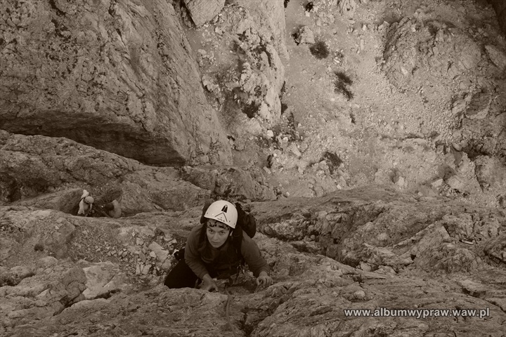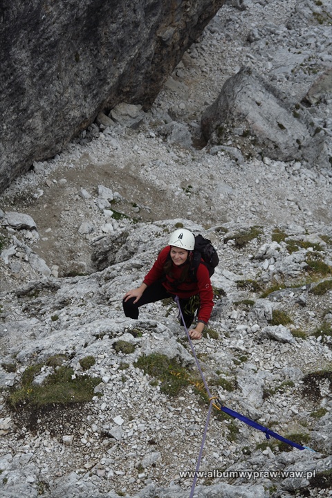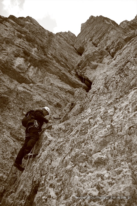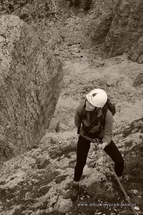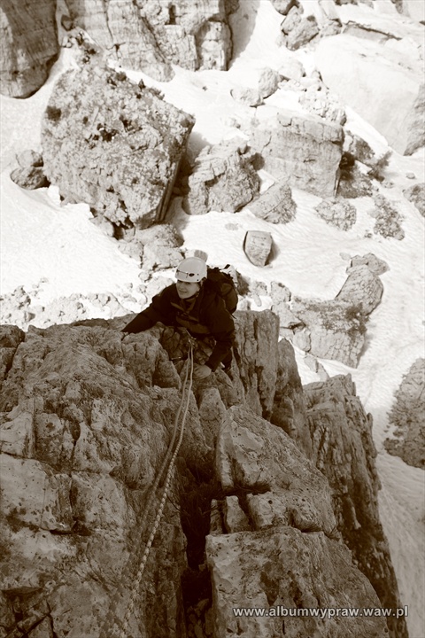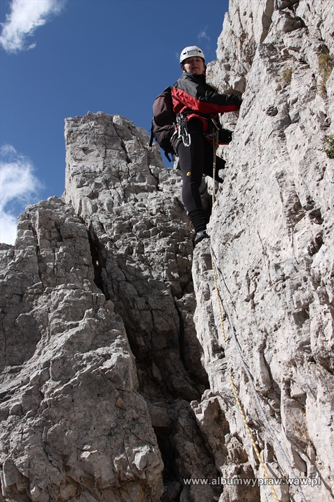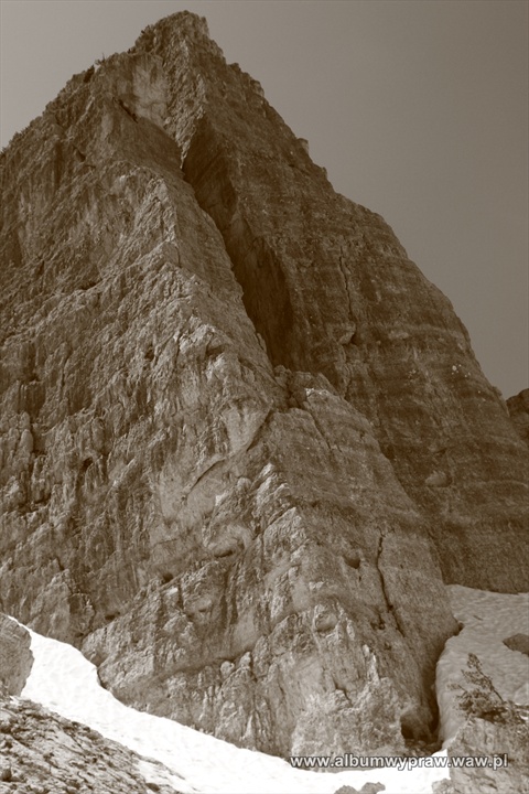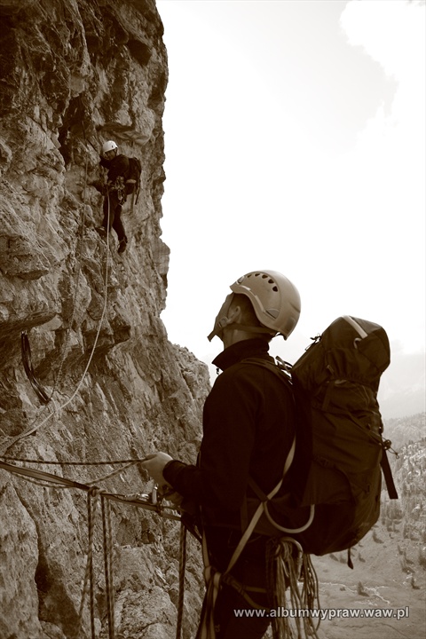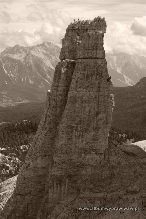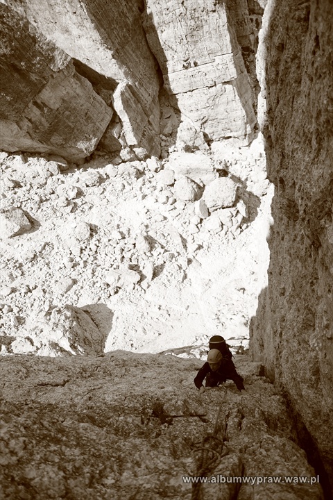 CINQUE TORRIGdzie leży Cinque Torri Cinque Torri znajduje się w regionie Cortina d_Ampezzo w północnych Włoszech, w samym sercu Dolomitów. Grupa skalna składa się z pięciu głównych turni, które wyrastają ze skalno-trawiastego płaskowyżu na wysokości około 2361 m. Rejon jest łatwo dostępny - można tu dotrzeć pieszo lub kolejką z przełęczy Falzarego, co czyni go bardzo popularnym zarówno latem, jak i zimą. Charakterystyka wspinania Najwyższą turnią grupy jest Torre Grande, której wierzchołek wznosi się około 150 metrów ponad otaczający teren. Jak na Dolomity ściany nie są bardzo wysokie, ale oferują: świetną, litą skałę, dużą koncentrację dróg na małej przestrzeni, szybkie podejścia pod ściany, logiczny przebieg linii wspinaczkowych, możliwość łączenia wielu dróg jednego dnia. Wspinanie w Cinque Torri ma typowo dolomicki charakter - dominują płyty, kominy, zacięcia i filary, a asekuracja często opiera się na stałych punktach oraz stanowiskach zjazdowych. Drogi wspinaczkowe i trudności Rejon słynie z krótkich, wielowyciągowych dróg wspinaczkowych, które świetnie nadają się na: pierwsze doświadczenia we wspinaniu wielowyciągowym w Dolomitach, czy rozgrzewkę przed większymi ścianami. Większość dróg ma od 80 do 150 metrów długości Robert Remisz ![]() 2012.07 - wspinamy się na Torre Grande droga Delle Guide. ![]() Torre Romana "Zacięcie Północne". ![]() ![]() ![]() ![]() Zejście jednym 50 metrowym zjazdem. ![]() 2010.07 - Cinque Torri. ![]() Wspinamy się na najwyższą skalną turnię Cinque Torri - Torre Grande 2361 metrów. ![]() Pierwszymi zdobywcami północnego wierzchołka byli w 1880 roku G. Ghedina Tomas i C.G. Wall. ![]() Droga ta oferuje urozmaicone, łatwe wspinanie w zachwycającym otoczeniu. ![]() ![]() ![]() Zejście zjazdami wzdłuż drogi wejściowej. ![]() ![]() 2009.06 - podchodzimy pod Cinque Torri, w tle Tofana di Rozes. ![]() Choć czerwiec, to zalega jeszcze sporo śniegu. ![]() Nasz cel - północna ściana pięknej turni Torre Lusy. ![]() Ostatnie metry podejścia pod start drogi. ![]() Pierwszy wyciąg, dokucza zimny wiatr i lodowata skała. ![]() Czwarty wyciąg, do wszystkiego można się przyzwyczaić :-) ![]() Zejście ze szczytu turni na południową stronę do ringa zjazdowego. ![]() 40 metrowy zjazd, ![]() w zupełnej ekspozycji. ![]() 2008.09 - widok na wizytówkę Cinque Torri, najokazalszą skalną turnię Torre Grande 2361 metrów. ![]() Turnie Torre Romana z lewej oraz bliźniacza Torre Barancio. ![]() Te same turnie z innej perspektywy. ![]() Wspinanamy się na Torre Latina drogą normalną. ![]() Po dwóch długich, ale łatwych wyciągach ponad 50 metrów zjazdu w dół. ![]() Kolejny nasz cel to Torre Inglese. ![]() Najpierw dwa wyciągi wspinamy się na niższą turnię, ![]() po czym zjeżdżamy na przełączkę ![]() i robiąc jeden długi wyciąg ![]() przechodząc płytę wchodzimy na Torre Inglese. ![]() Kolejnego dnia naszym celem są oparte o siebie turnie skalne: Torre Quarta Alta i Torre Quarta Bassa. ![]() Na niższą Torre Quarta Bassa prowadzi po połogiej, dość litej płycie trzywyciągowa droga normalna. ![]() Na stanowisku po pierwszym wyciągu. ![]() Drugi wyciąg. ![]() Ostatni wyciąg. (07.2012) ![]() Po zjeździe na przełączkę dalsza wspinaczka na wyższą turnię Torre Quarta Alta. ![]() Na stanowisku w kopule podszczytowej. W dole widać wierzchołek niższej turni Torre Quarta Bassa, na którym siedzi czwórka wspinaczy. ![]() Na szczycie. ![]() Ostatni trzeci zjazd z Torre Quarta Alta w szczelinę pomiędzy turniami. ![]() Kończymy wspinanie na Cinque Torri. W tle jedne z wielu turni w Dolomitach - Cimy Formin. Design by Robert Remisz |